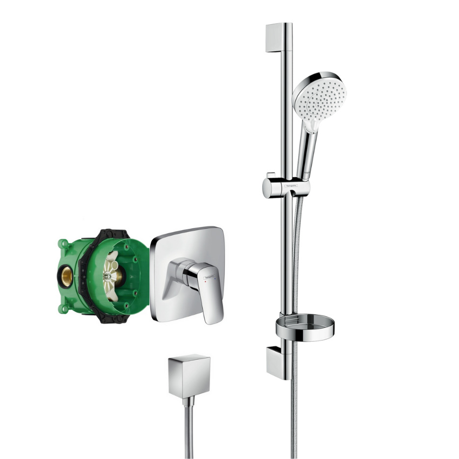 Hansgrohe Logis Pack Mitigeur encastré + Fixfit Square + Barre de douche + Porte-savon + Douchette à main, Chrome (71605000-Crometta2)