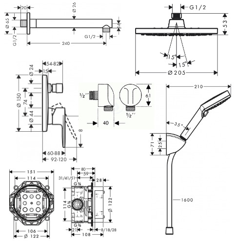 Caractéristiques du Set de douche tout en 1 avec Douche de tête 205mm + Douchette 2 jets, Chrome (VernisBlend-1) :