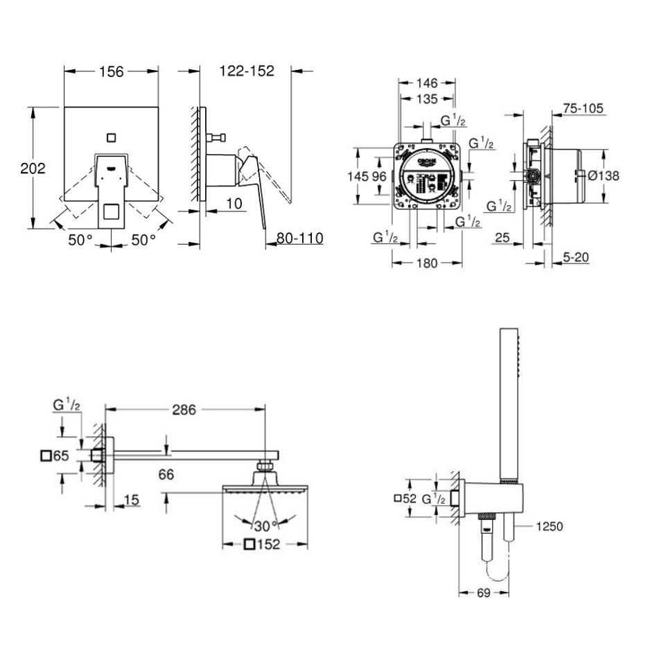 Caractéristiques du Set mitigeur mécanique + Douchette stick 1 jet avec support + Douche de tête + Corps d'encastrement, Grohe (24062000-Eurocube) :