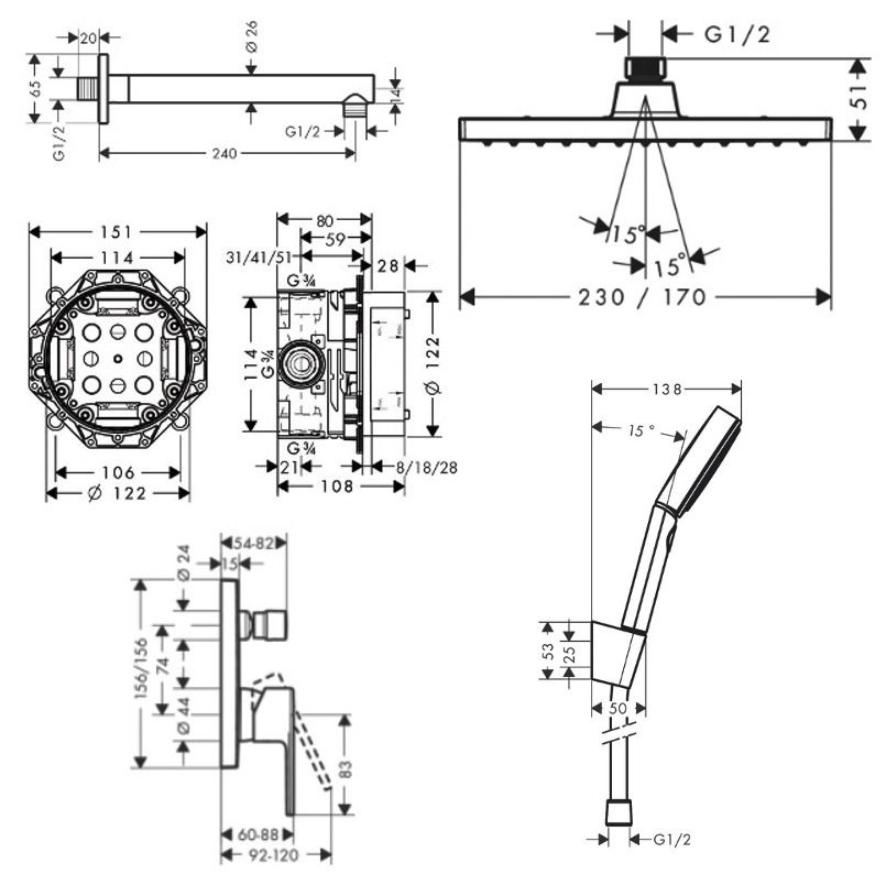 - Diamètre douche de tête (mm):230