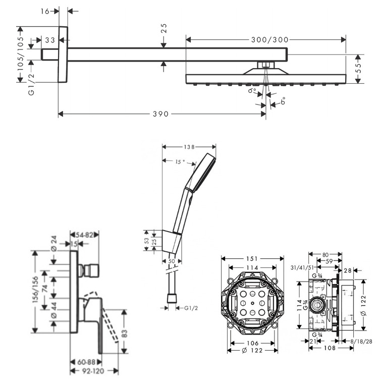 Caractéristiques du Set de douche encastré tout en 1 avec douche de tête 300 XXL + Douchette 3 jets Performance, Hansgrohe Vernis Raindance Pulsify :