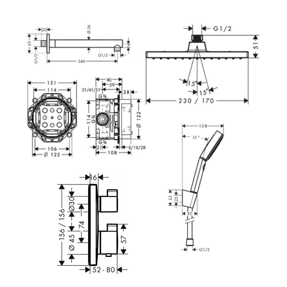 Caractéristiques du Set de douche encastré tout en 1 avec douche de tête 230 XXL + Douchette 3 jets Performance, Hansgrohe :