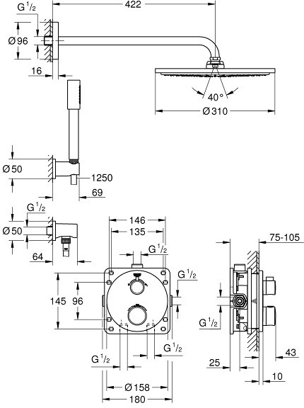Caractéristiques du Set de douche Grohe Rainshower Cosmopolitan 310 avec thermostat encastré, chrome (34731000) :