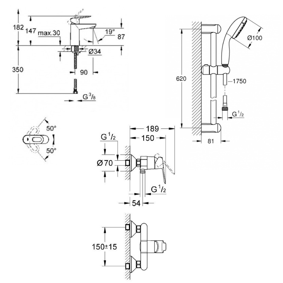 Caractéristiques du Set mitigeur de douche + Barre de douche avec douchette 2 jets + Mitigeur lavabo, Chrome, Grohe BauLoop (23337000 & 23340000) :