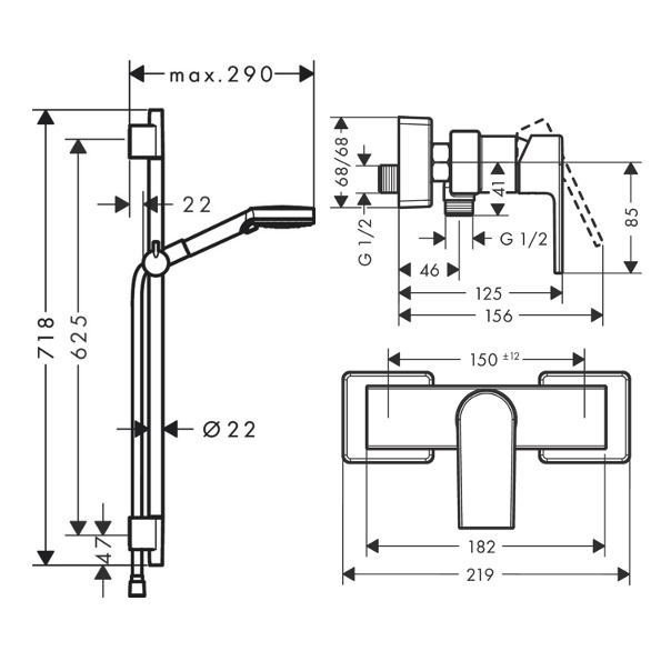 Caractéristiques du Set de douche avec Mitigeur de douche + Douchette à main 2 jets + Barre 65cm, Noir mat, Hansgrohe (71650670-Vernis) :