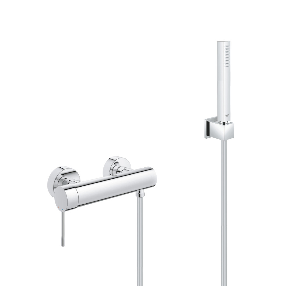 Grohe Set de douche Mitigeur de douche Essence + Douchette Stick 1 jet, support mural, flexible, Chrome (33636001-CUBESTICK)