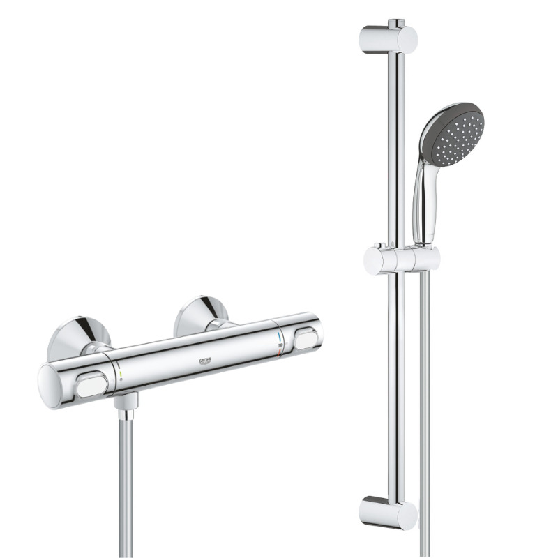 Profitez de toutes les technologies de Grohe grâce à ce Set de douche Mitigeur de douche thermostatique + Douchette, Barre de douche 600mm, Flexible 1750mm, Chrome (34840000-Vitalio).