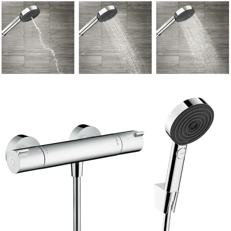 Hansgrohe Ecostat Mitigeur thermostatique douche + Douchette à main XXL 105mm 3 jets, Flexible de douche 125cm, support mural