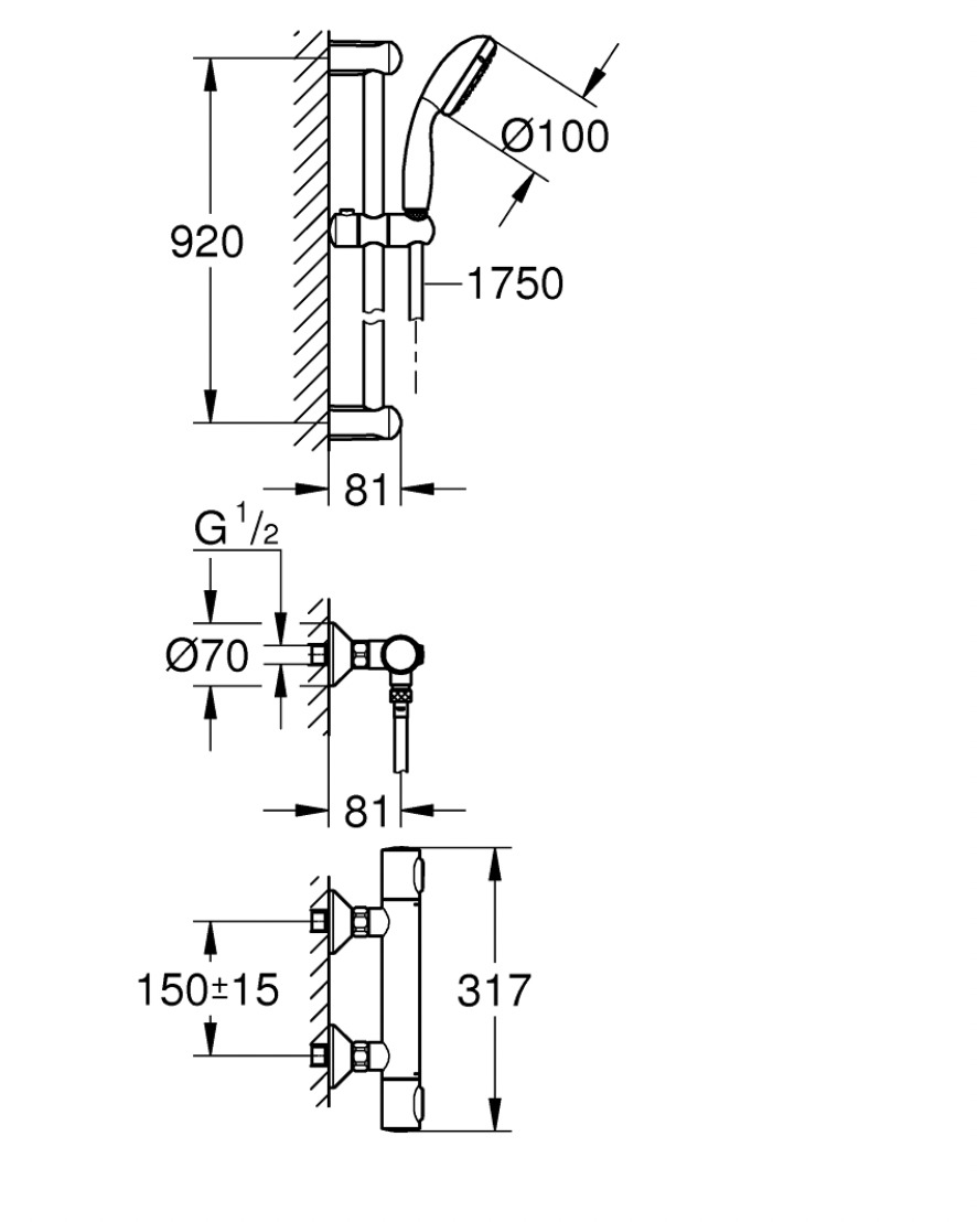 Caractéristiques du Grohtherm 500 mitigeur thermostatique douche 1/2" avec ensemble de douche, Chrome :