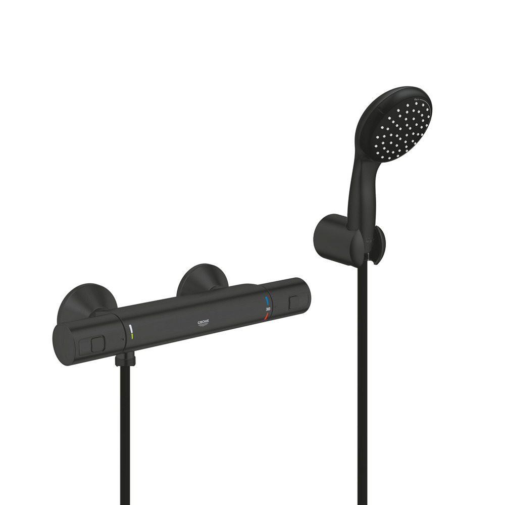 Grohe Set de douche mitigeur de douche thermostatique 1/2" + Douchette 2 jets + support mural + Flexible 1750 mm, noir mat