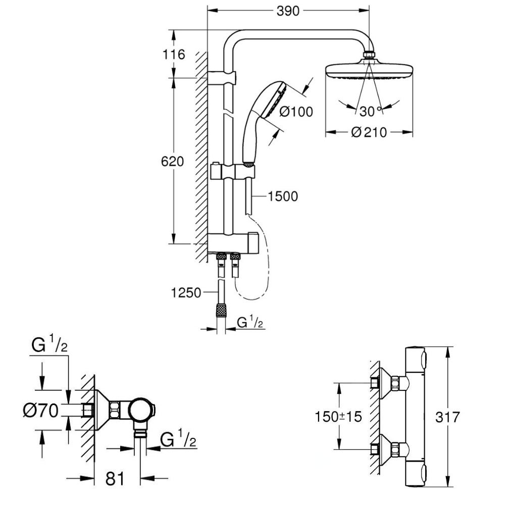 Caractéristiques du Set Vitalio Start System 210 Colonne de douche avec inverseur manuel + Mitigeur de Douche thermostatique, Chrome (26382001-FLOW-AMZ) :