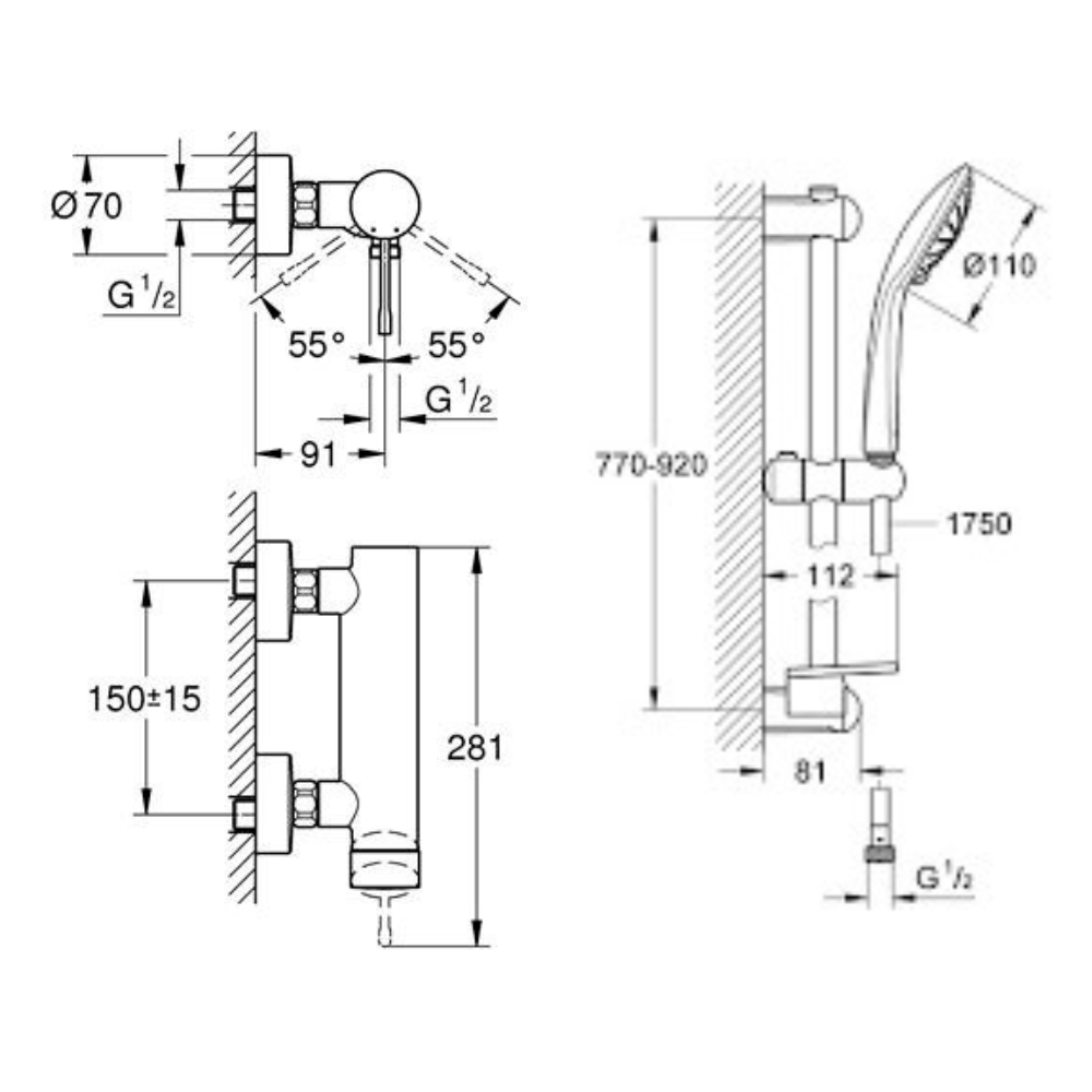 Caractéristiques du Set Mitigeur monocommande Douche Grohe Essence + Ensemble de douche complet 3 jets Grohe Euphoria 110 Massage, hard graphite brossé (33636AL1-SET) :