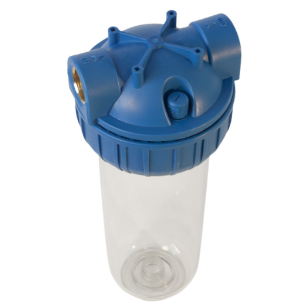 - La tête est équipée de raccords en laiton 3/4 "pour l'entrée et la sortie d'eau et d'une soupape de surpression qui libère la pression lors du remplacement de l'élément filtrant.