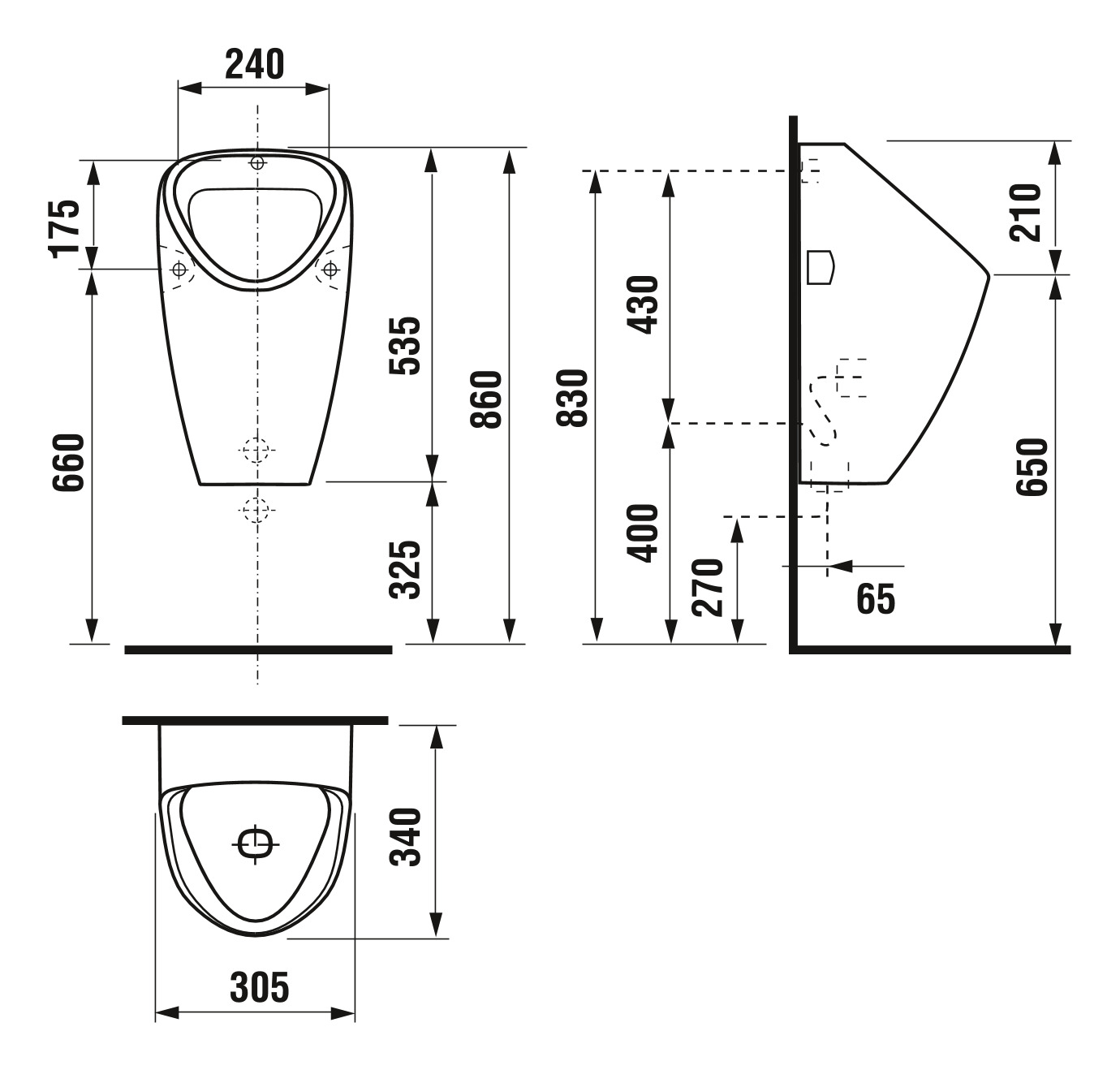 Caractéristiques de l'urinoir suspendu avec vidage horizontal arrière, alimentation interne Jika Golem (H8430600000001) :