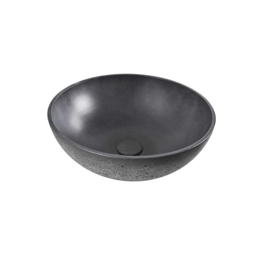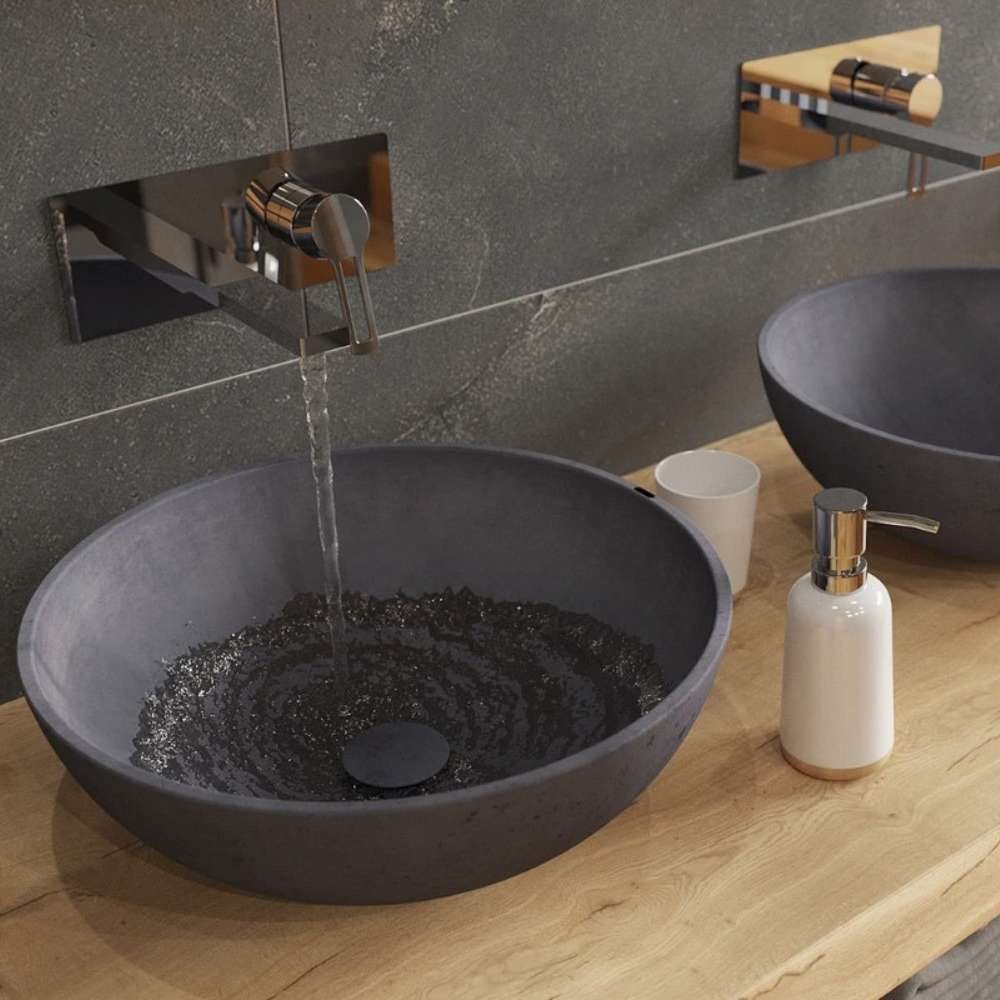 Lavabo design en béton avec des parois minces de couleur anthracite. En tant que matériau naturel, le béton a son propre caractère. Il a une couleur différente et chaque pièce produite est originale, légèrement différente de la précédente. Il change avec l'usage, ne reste pas le même, il peut contenir de petits pores et des microfissures, et ce sont ces propriétés qui sont les éléments clés de l'esthétique du béton et lui donnent son caractère distinctif.