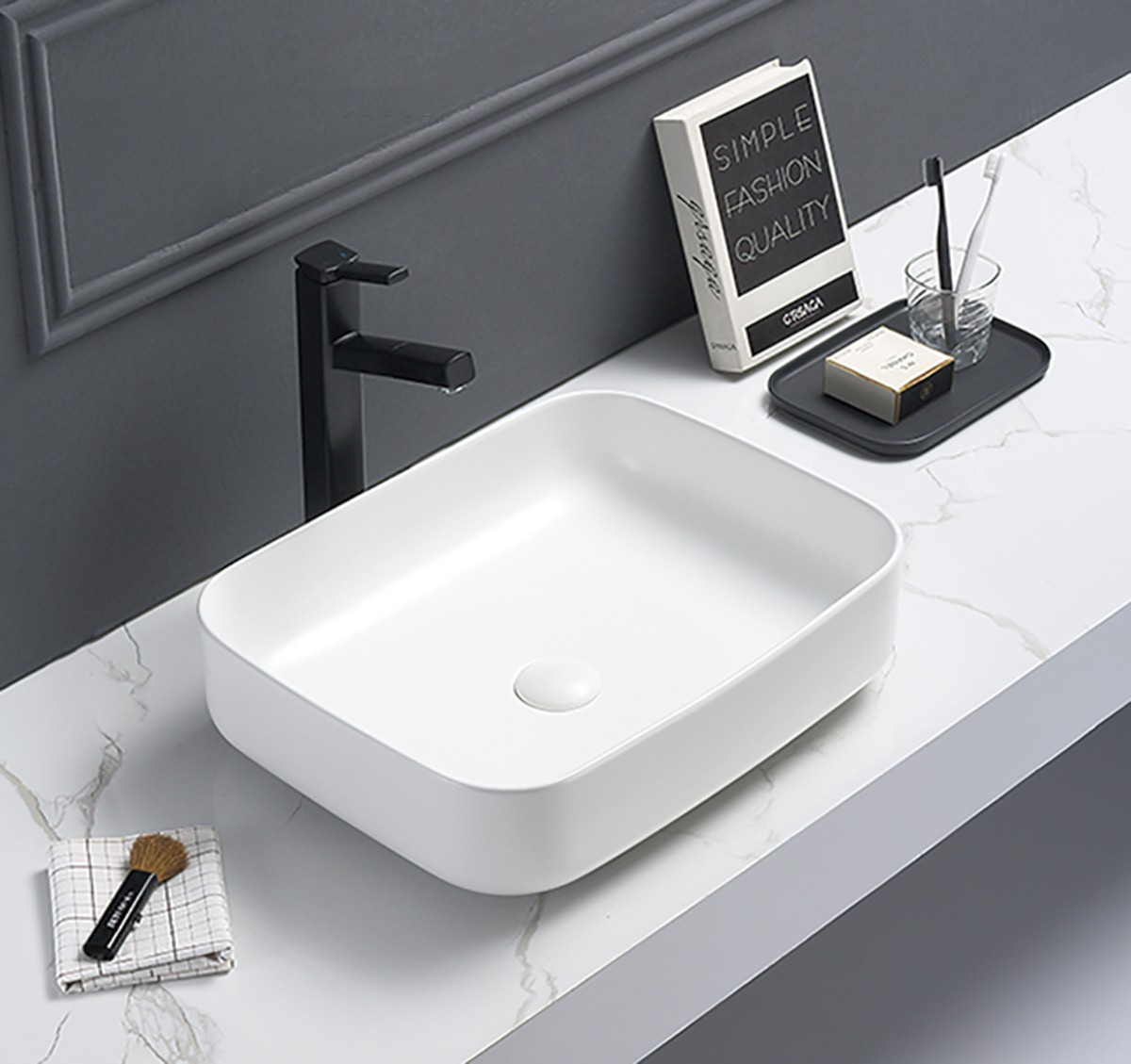 Caractéristiques du set vasque à poser rectangulaire + bonde à écoulement libre Swiss Aqua Technologies Infinitio blanc mat (SetSATINF5039M) :