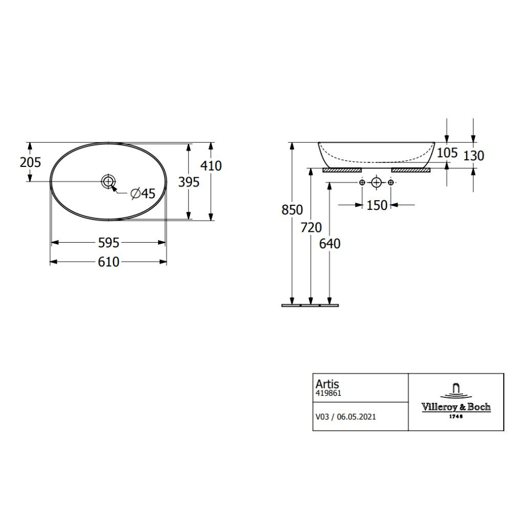 Villeroy & Boch Vasque à poser Artis, 610 x 410 x 130 mm, Blanc, sans trop-plein (41986101)