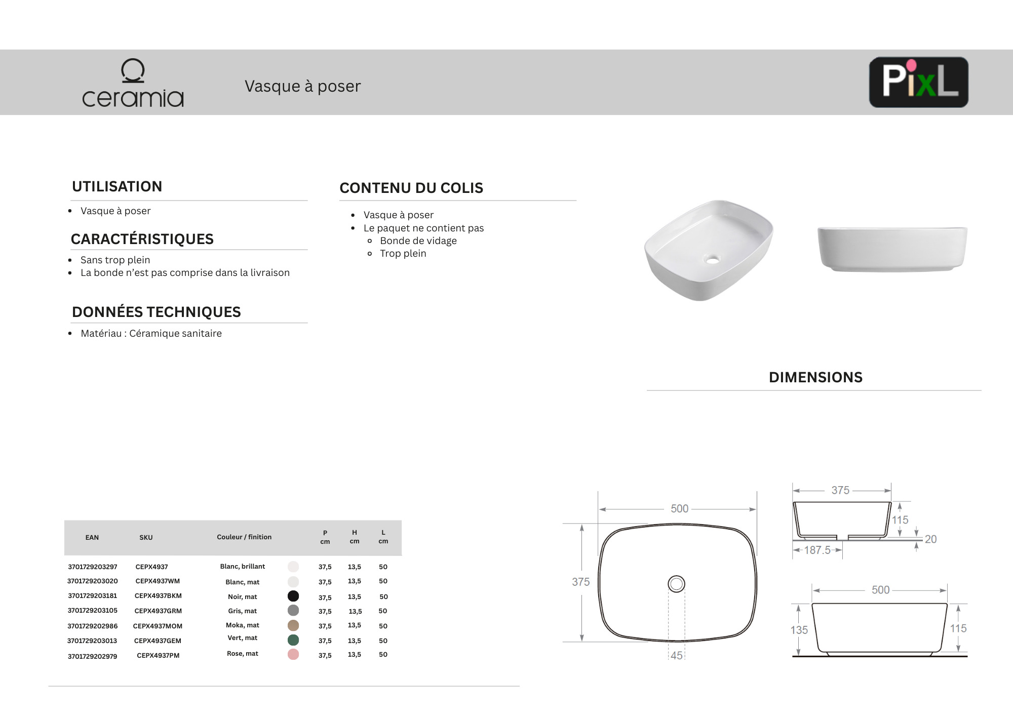 Caractéristiques de la vasque à poser 50 x 37,5 x 13,5 cm, sans trop-plein, Ceramia PixL, rose mat (CEPX4937PM) :