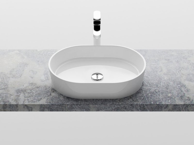 Le lavabo d'auteur, fabriqué en marbre coulé, est inspiré par la forme géométrique de base de cercle. Dans la salle de bains, il compense idéalement la sévérité des autres éléments orthogonaux, comme des carrelages, la cabine de douche ou le mobilier. Il convient pour une installation sur une plaque.